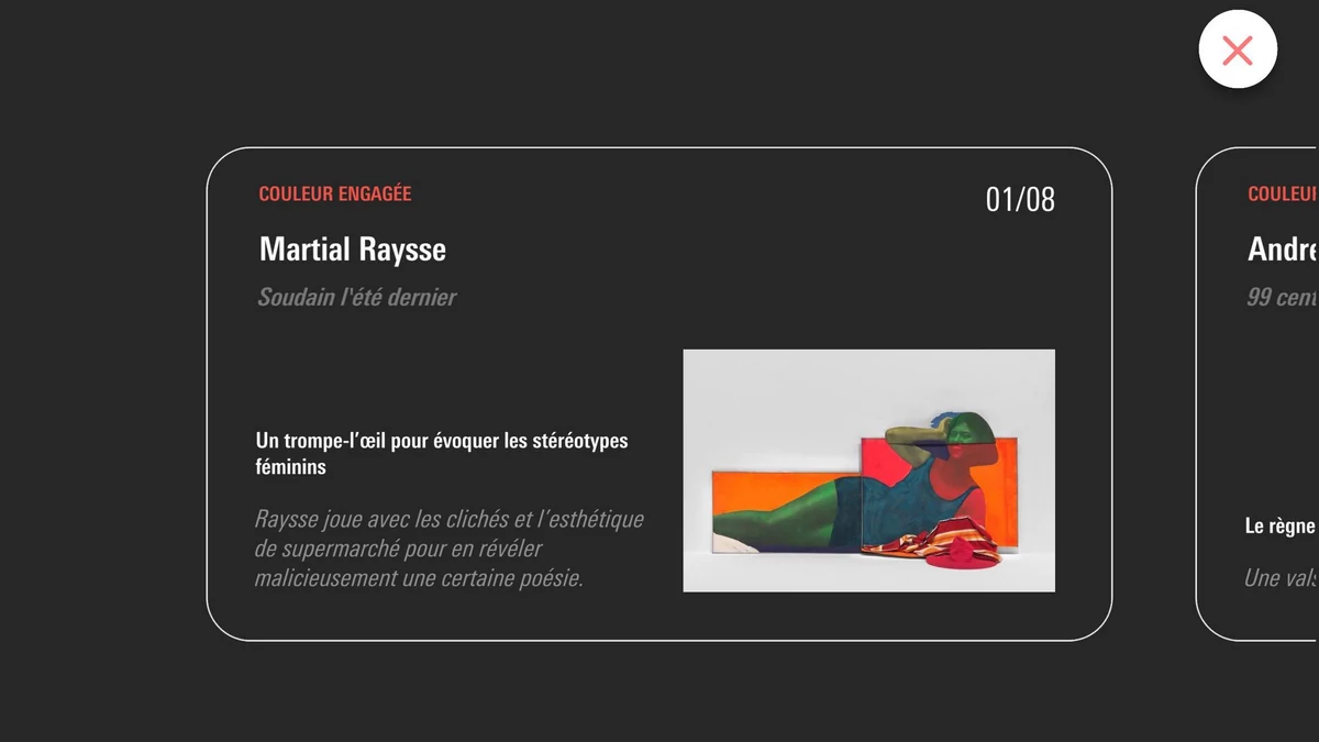 Nous pouvons notamment débloquer, au niveau trois, les œuvres de Martial Raysse, Andreas Gursky, Claude Lévêque, Andy Warhol, James Rosenquist, Niki de Saint Phalle, Djamel Tatah et Gérald Fromanger. Les descriptions et présentations des œuvres sont très concises : une photographie de l’œuvre, le nom de l’artiste, le nom de l’œuvre et une phrase en rapport avec le thème du niveau et l’œuvre de l’artiste (la couleur, son engagement…). Cette simplicité les rend accessibles. Nous pourrions cependant reprocher au jeu d’être trop succinct sur les œuvres, il aurait pu être intéressant d’ajouter quelques informations supplémentaires, comme des dates ou les dimensions des œuvres. Dans l’état actuel du jeu, des recherches complémentaires s’imposent pour comprendre les œuvres. Une option de zoom sur les photographies des œuvres serait aussi bienvenue : il est difficile de bien les observer, surtout lorsque l’on joue sur smartphone.